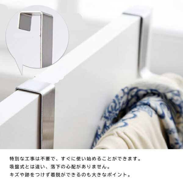 フック式 厚み2cmまでに対応ステンレスタオル掛け フック式だから引っ掛けるだけで設置OK!簡単に着脱できるタオルハンガー 流し台や洗面台のドア、引き出しなどに取り付けられるステンレス製のタオルハンガー。