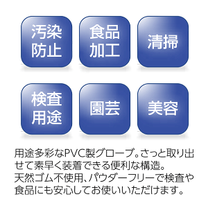 検索ワード PVC PVC手袋 PVCグローブ 塩化ビニル 塩化ビニール 使い捨て 100枚 パウダーフリー 粉なし 汚染防止 食品加工 調理 料理 生物 清掃 掃除 大掃除 検査 園芸 美容 感染防止 感染予防 中国製 CE 適合 簡単装着 素早く 取り出し簡単 メンズ レディース 男女 手袋 ディスポーザブル ディスポーザブルグローブ