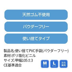 【製品について】 ●製品名:使い捨てPVC手袋(パウダーフリー) ●素材:ポリ塩化ビニル ●サイズ:甲幅105±3 Mサイズ Lサイズ ●原産国:中国 MADE IN CHINA ●CE基準適合 ●天然ゴム不使用 ●パウダーフリー ●使い捨てタイプ 用途多彩なPVC製グローブ。