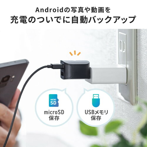 <特長>●Androidスマートフォンの写真や動画を充電するたびに自動バックアップするカードリーダーです。